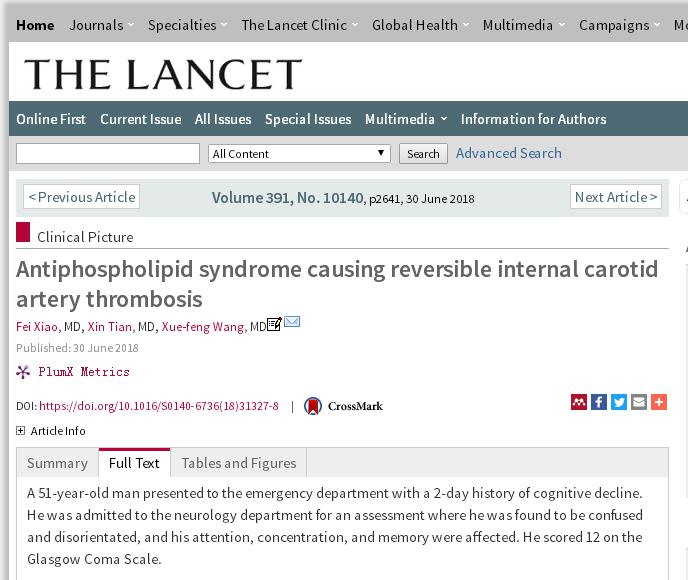 6月30日,重庆医科大学附属第一医院王学峰、肖飞课题组的神经病学临床研究成果在国际顶级医学期刊The Lancet(中文名《柳叶刀》,IF=53)上在线发表。文章报告了一名患者因抗磷脂综合征而引起可逆性颈内动脉血栓的形成。The Lancet是目前世界医学界最权威的学术刊物之一,也是影响因子最高的SCI刊物之一。