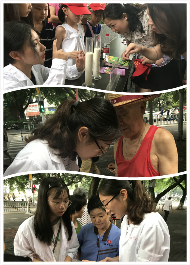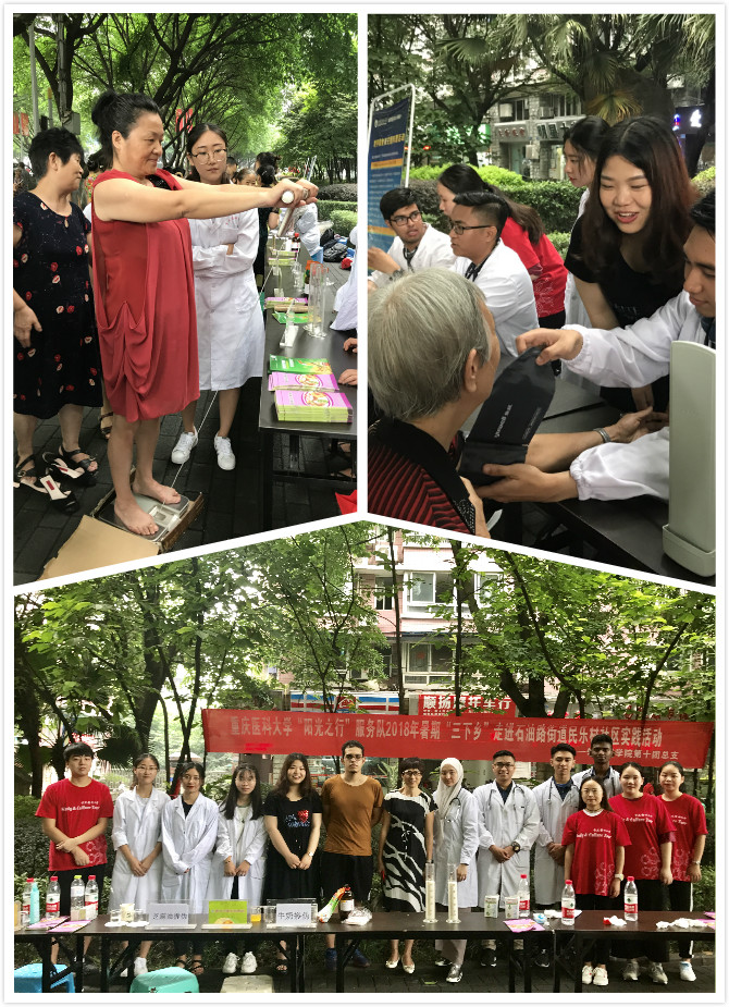 7月6日,6名来自印度、印度尼西亚、哥伦比亚、塔吉克斯坦等国的临床医学专业留学生和4名英语专业中国学生组成的“阳光之行”爱心医疗服务队,带着由留学生制作的医学绘画作品和医学模型,在团总支书记梅琳老师的带领下,开展大学生暑期“三下乡”活动,为石油路街道的居民们开展义诊和科普宣传教育。外国语学院院长杨红参与此次活动。 本次志愿服务活动得到学校实验教学管理中心汪洋老师团队和公众健康传播服务中心的大力支持。活动现场,“阳光之行”爱心医疗服务队与公众健康团队分工合作、相得益彰。留学生志愿者们为现场居民免费测量血压、做简单的测量诊断;血压异常者立即接受公众健康团队的体脂、血糖免费测量,并得到评估反馈及建议。 志愿者们还在现场进行了以“食品安全”为主题的科普演示,内容包括葡萄酒、牛奶、芝麻油和果汁掺假甄别测试,以及鉴别这几种食品真伪的简易鉴别法。市民们纷纷驻足观看,认真学习。义诊现场,市民们都被“洋医生”吸引了注意力,纷纷上前咨询,接受义诊。“婆婆,您有点低血压。”留学生们一边为老人们测量血压,一边用带着重庆方言口音的中文跟他们热情地交流着。交流不畅时,英语专业的志愿者们就担任翻译,确保义诊顺利进行,服务到位。“建议您平时饮食要尽量清淡,不要吃太咸和油腻的食物,每天早上起床散步一小时……”塔吉克斯坦留学生白娜为一位血压偏低的老婆婆讲解平时该如何保养身体,老婆婆仔细聆听,不停地点头。 活动现场,中外志愿者队员们还向社区居民们分发了食品安全科普手册以及健康知识解惑手册,让居民们更加系统了解食品安全和健康知识,从而做到全民打假。居民们都表示希望以后能多开展这样的活动,加大健康知识宣传,为他们提供义诊服务,让他们在社区也能学到医学保健知识。 此次重庆医科大学外国语学院“三下乡”社会实践活动给广大市民们带去了健康和关爱,得到了广大居民的欢迎与肯定。“三下乡”社会实践活动不仅培养了医学生们的社会责任感,弘扬了国际志愿者精神,同时展示出我校留学生积极的学习风貌和优秀的专业素养,宣传了我校留学生培养的多元化、人文化、趋同教育成果。
